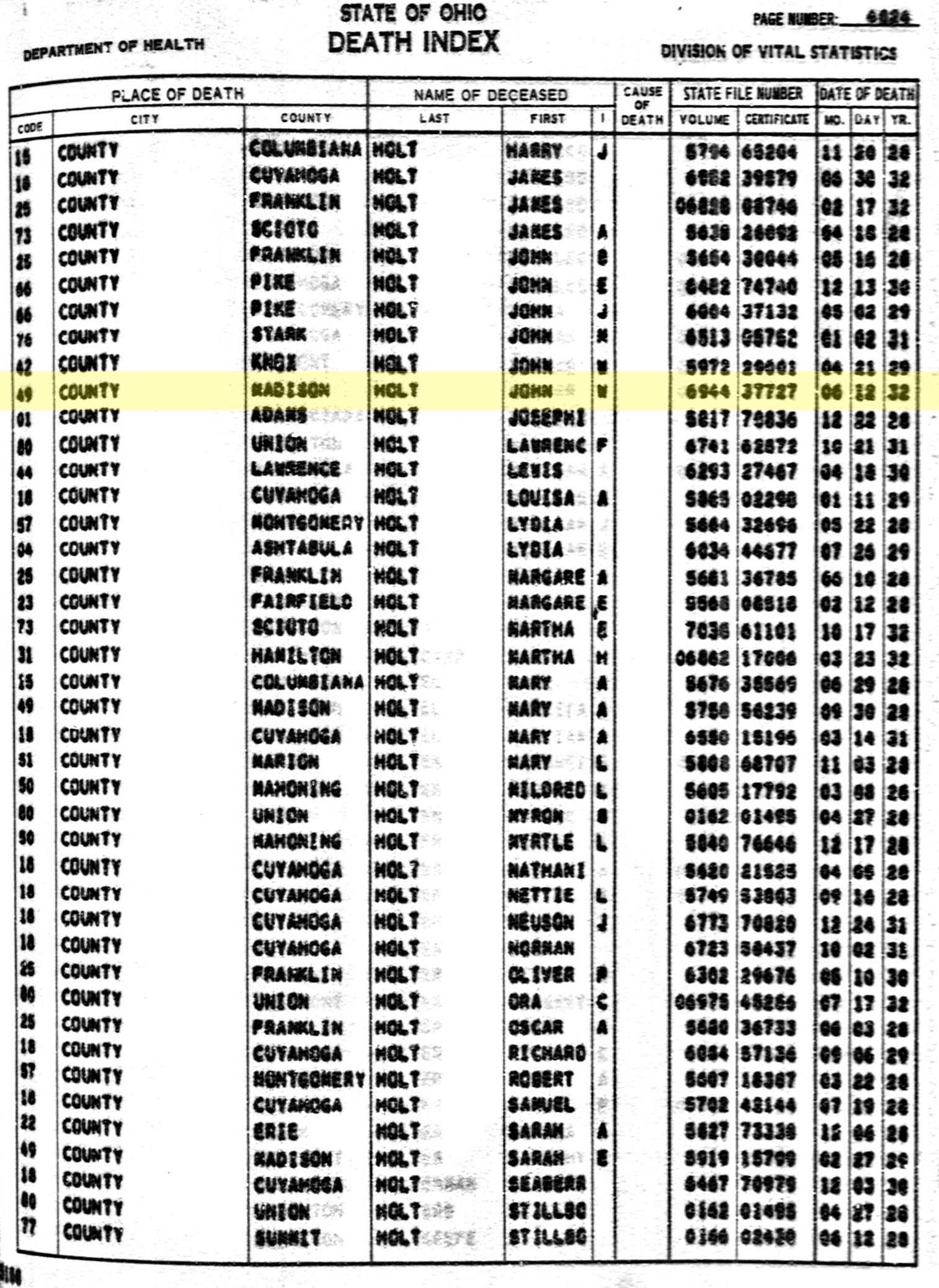 Ohio Deaths 1908-1932 1938-1944 and 1958-2002 - John W Holt