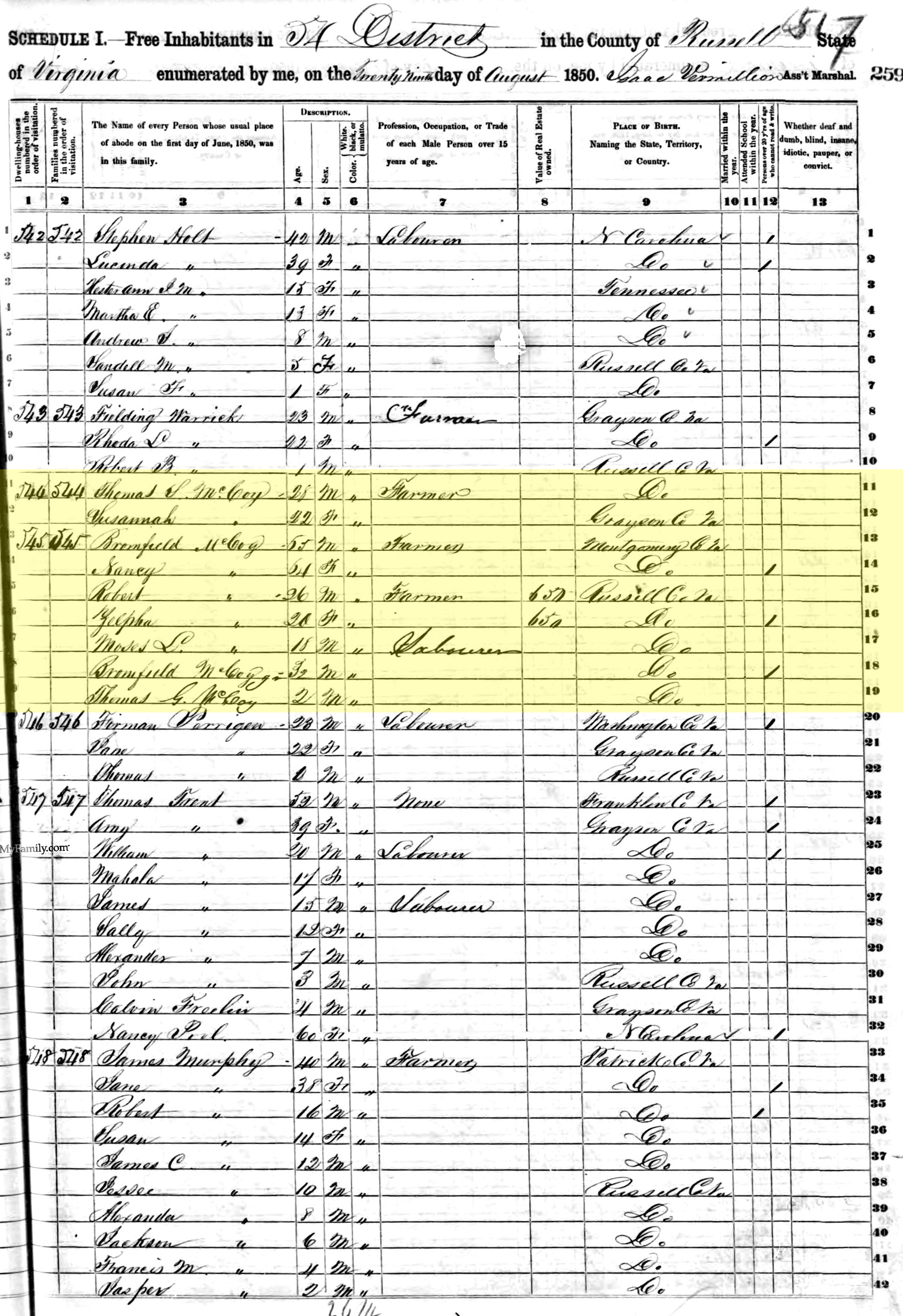 1850 United States Federal Census - Bromfield McCoy