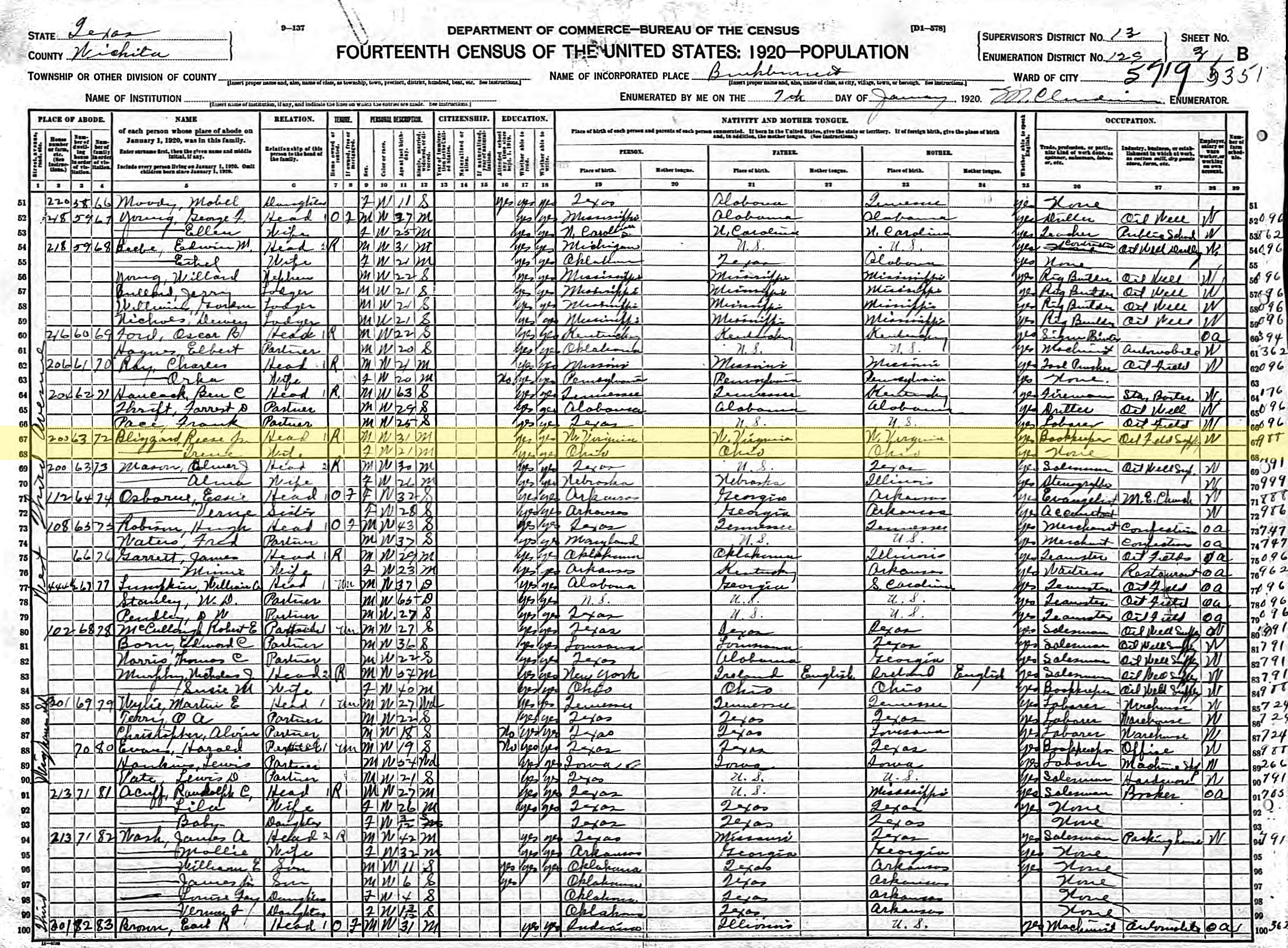 1920 United States Federal Census - Reese Blizzard Jr