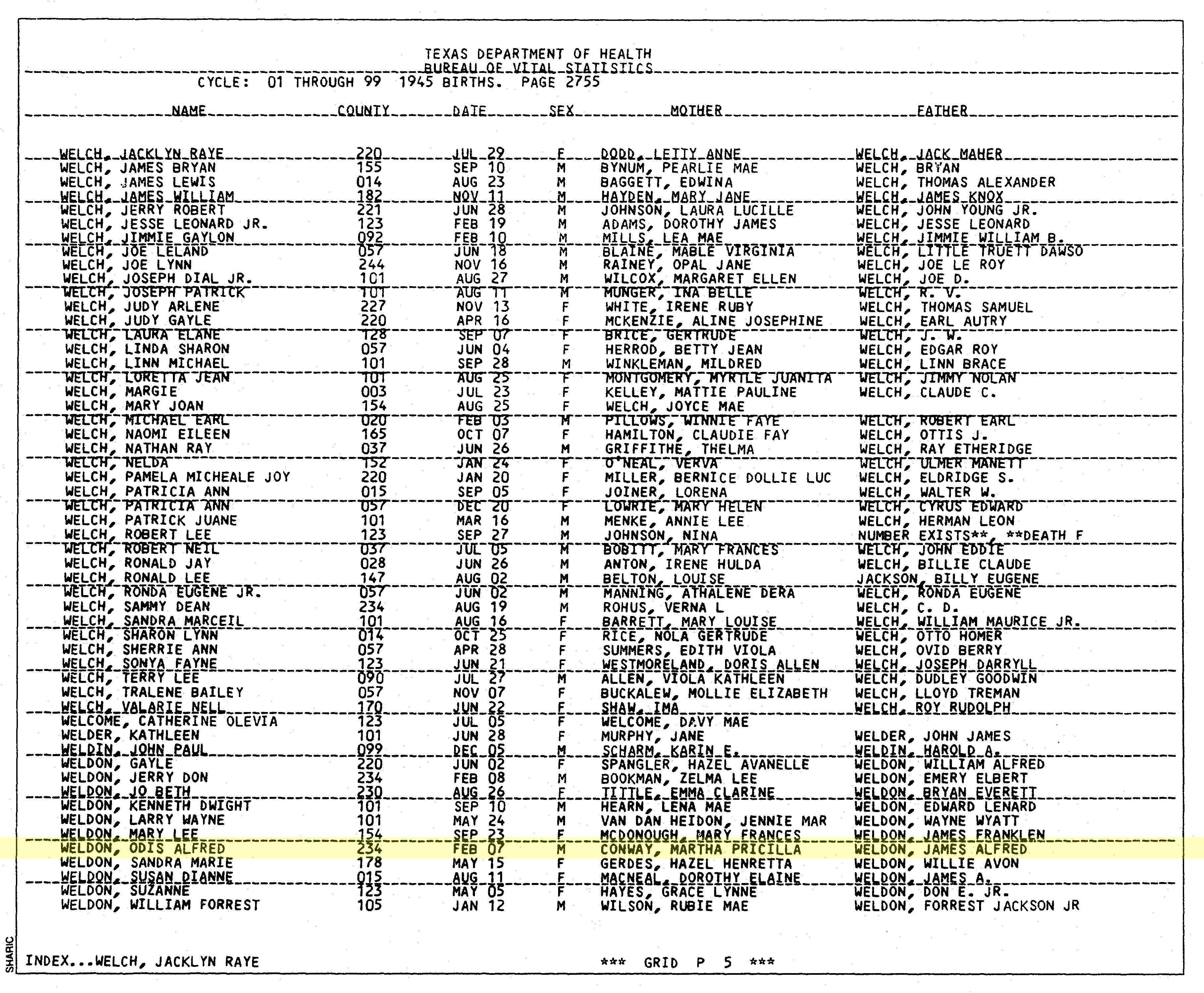 Texas Birth Index 1903-1997 - Odis Alfred Weldon