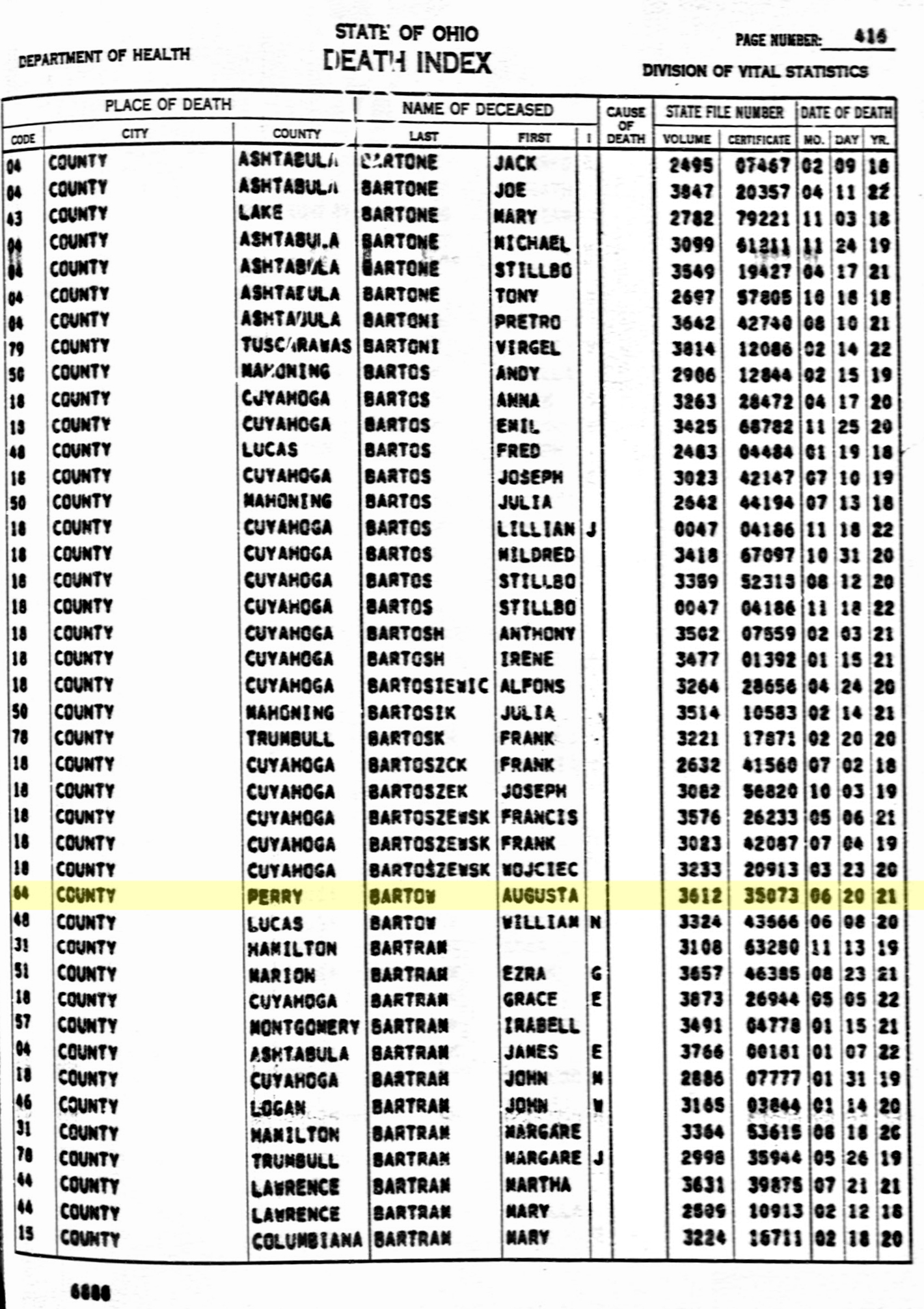 Ohio Deaths 1908-1932 1938-1944 and 1958-2002 - Augusta Bartow