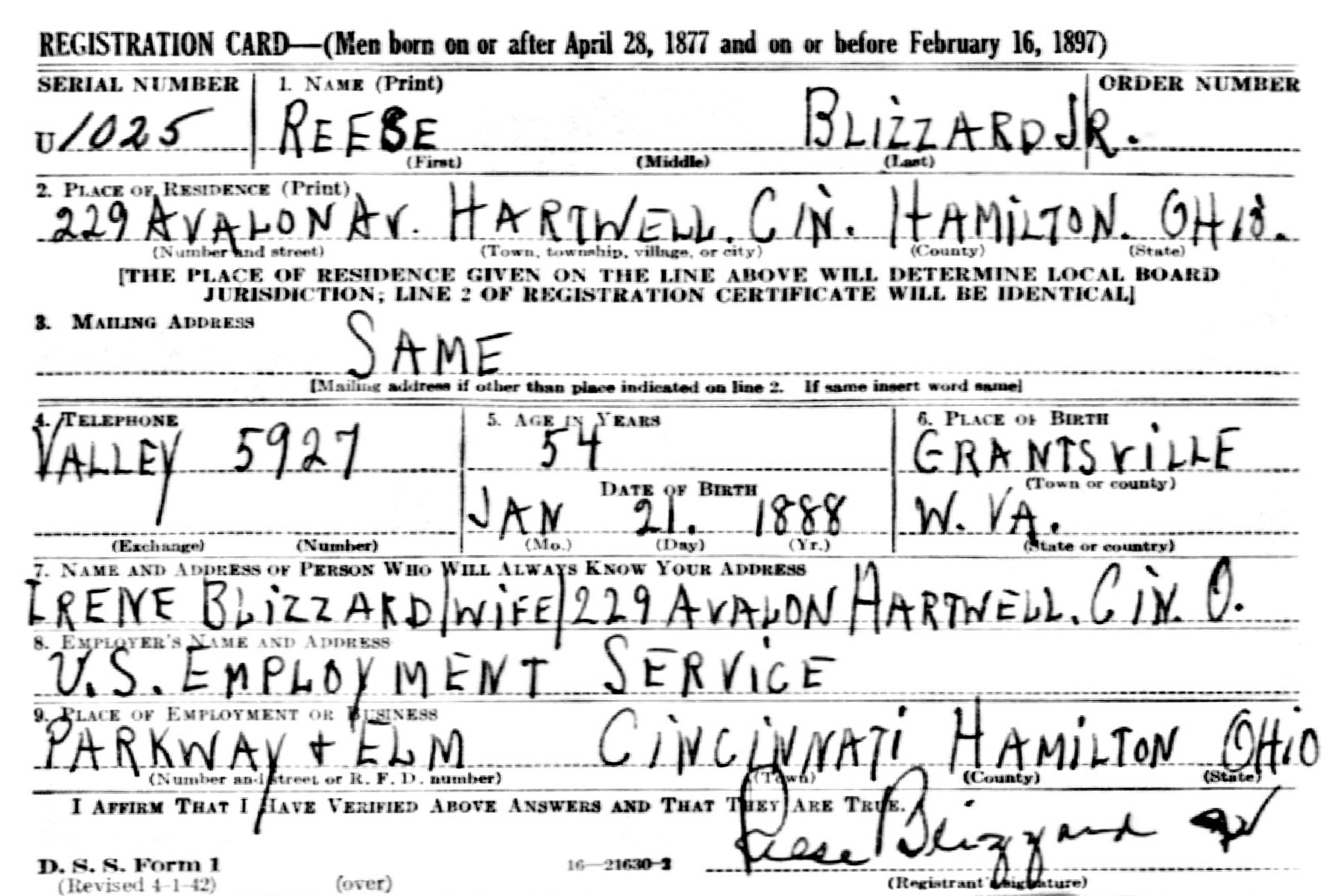 U.S World War II Draft Registration Cards 1942 - Reese Blizzard Jr