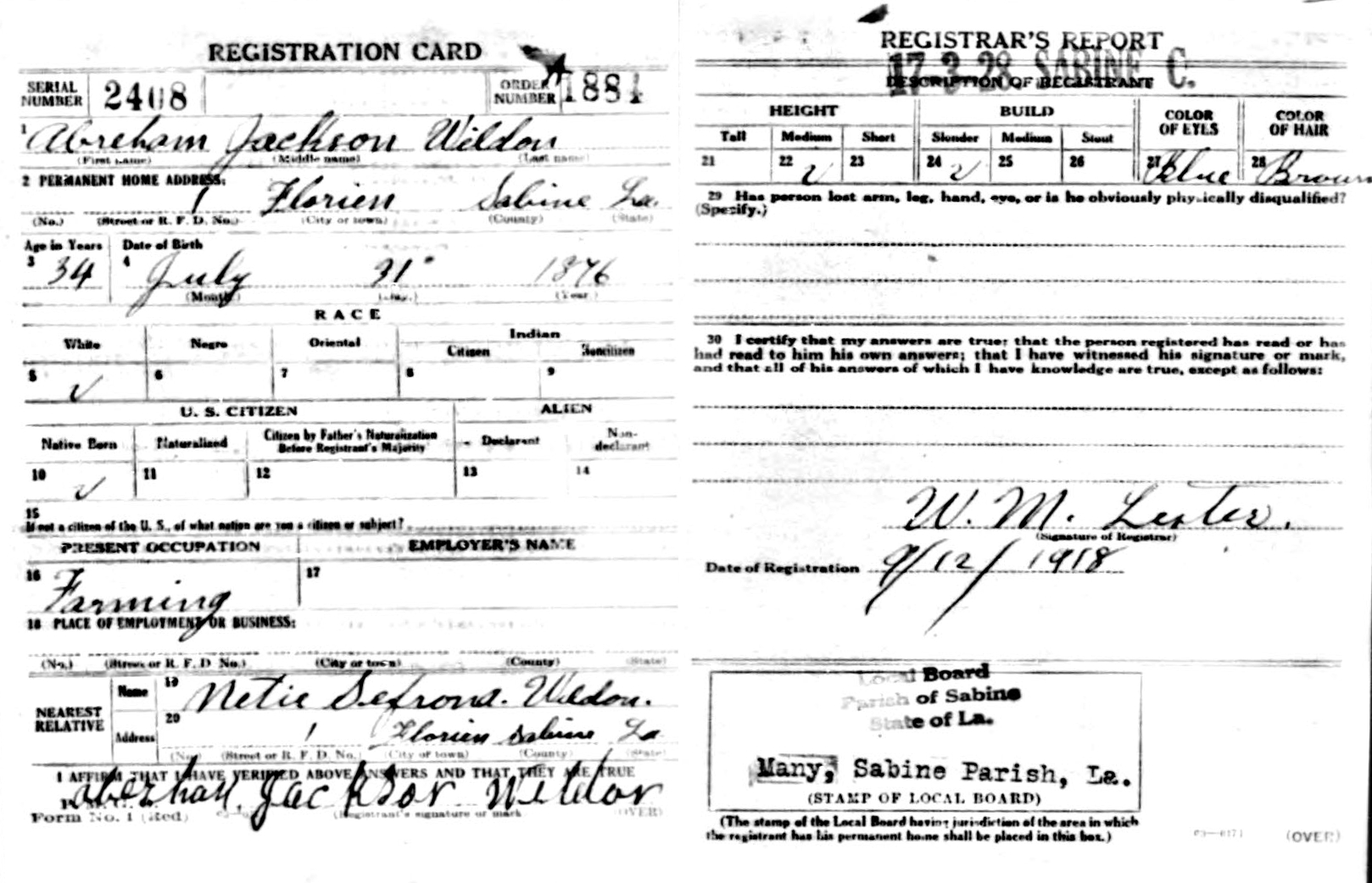 World War I Draft Registration Cards 1917-1918 - Abreham Jackson Weldon