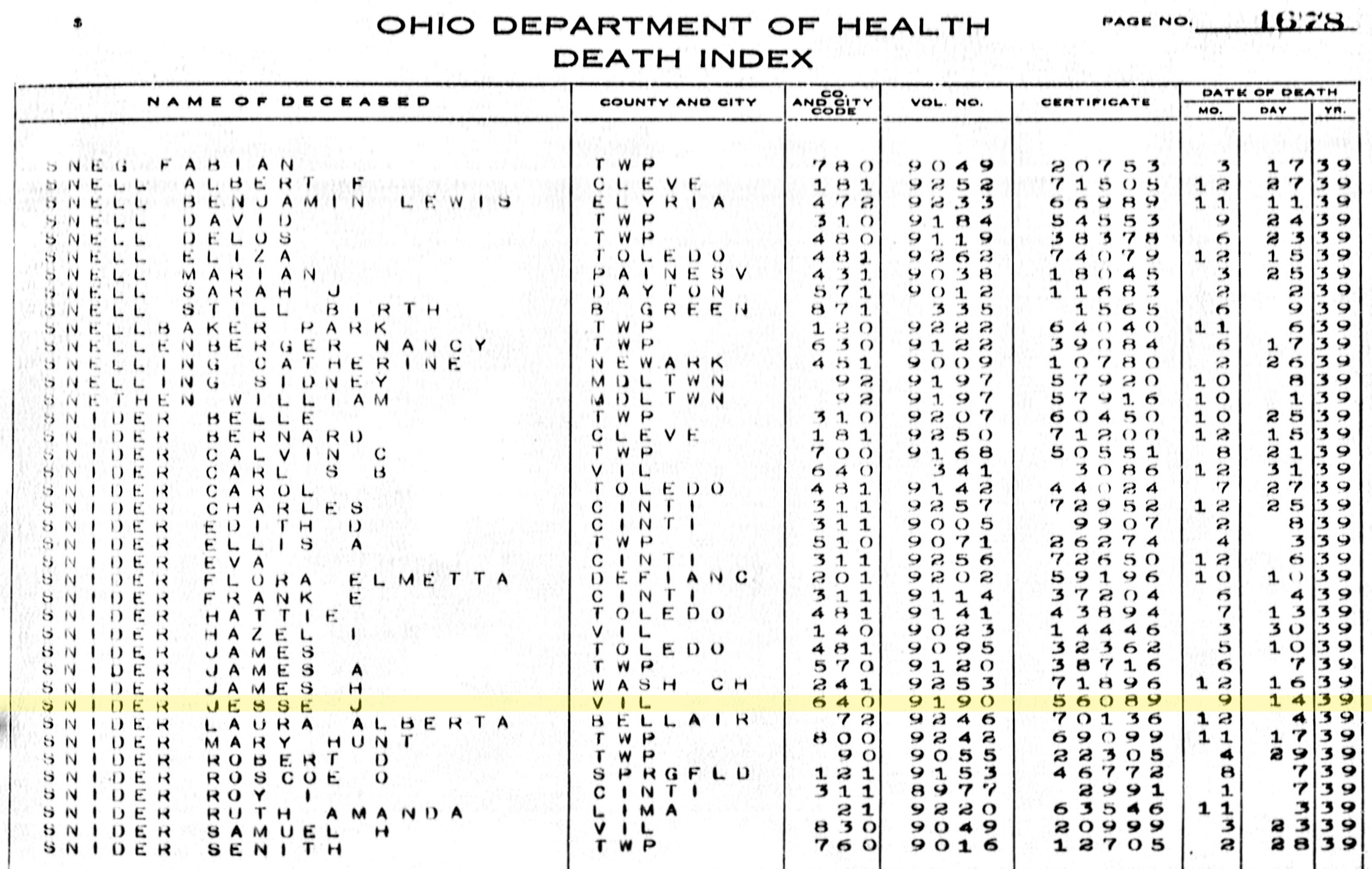 Ohio Deaths 1908-1932 1938-1944 and 1958-2002 - Jesse J Snider