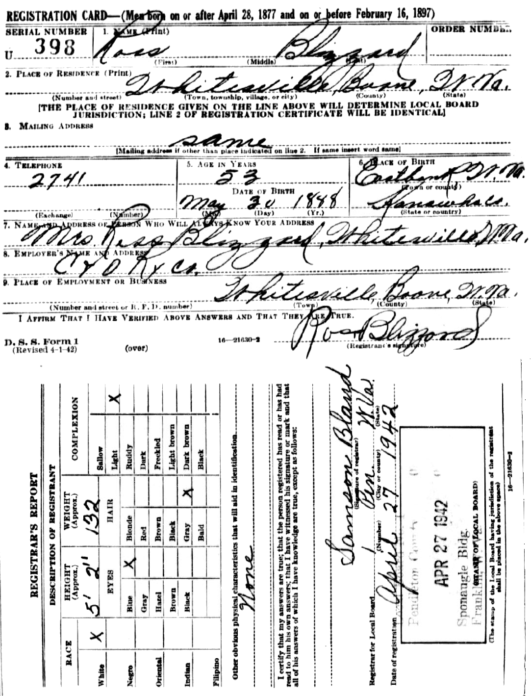 U.S World War II Draft Registration Cards 1942 - Ross Blizzard