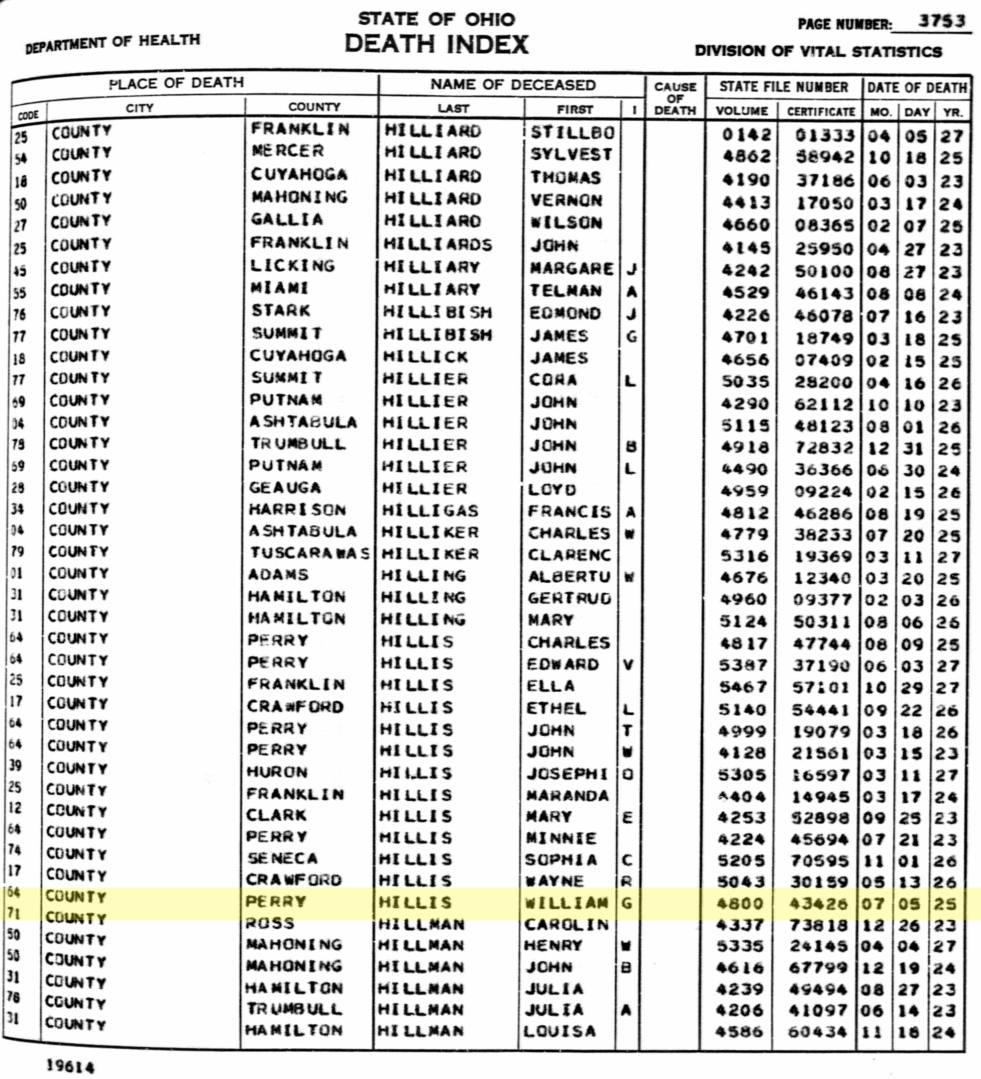 Ohio Deaths 1908-1932 1938-1944 and 1958-2002 - William G Hillis